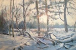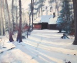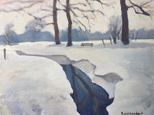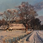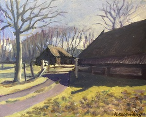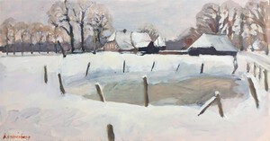 2020Eindelijk weer een dik pak sneeuw. Buiten ter plekke het landschap geschilderd, net op tijd, de sneeuw op de daken begon al te schuiven.