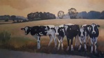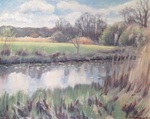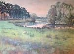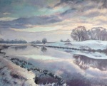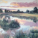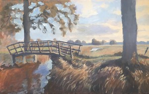 2015Dit schilderij laat zien dat ook een winterlandschap veel verschilldende kleuren heeft. De oevers van de Reest krijgen een warme gloed doordat de zon in de winter laag staat. Met de koude wolkenluchten erboven geeft dat mooie contrasten. Links van het grensriviertje is Drenthe en rechts Overijssel.