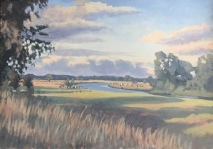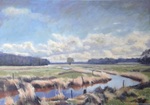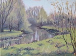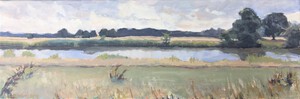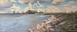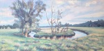 2014Doordat de Regge opnieuw meandert, is het Reggedal nog veel mooier geworden. Dit grote schilderij was een opdracht n.a.v. een klein werkstuk wat ik ter plekke had gemaakt bij de Regge achter de Steile Oever. (Ommen)